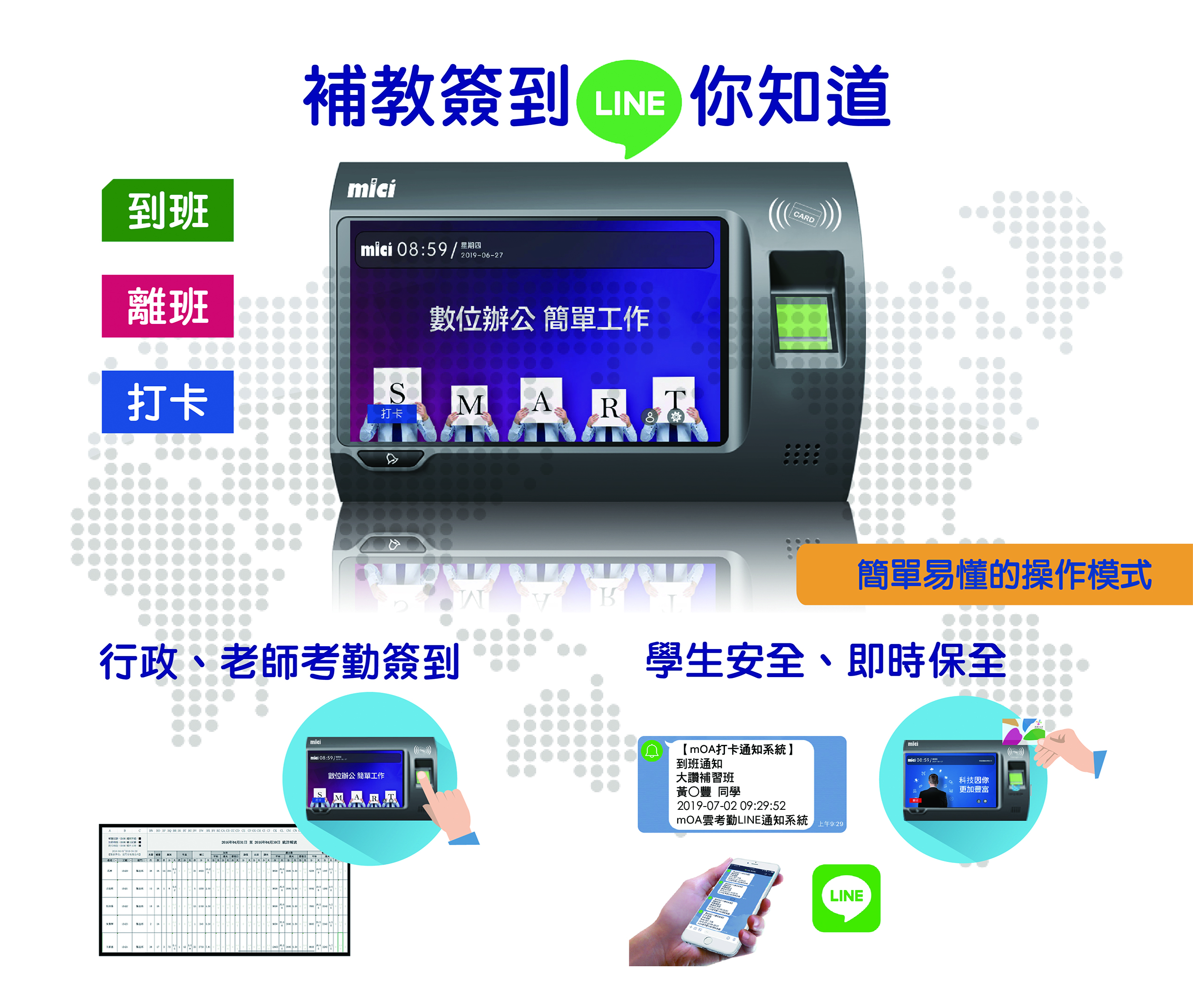 透過LINE即時傳送學生到班或離班狀況,並且滿足行政人員及老師日常出勤考勤應用,輕鬆轉出學生到班出勤報表,支援手機APP進行上下班打卡,分散多地安裝,網頁即時查看各校區考勤狀況~