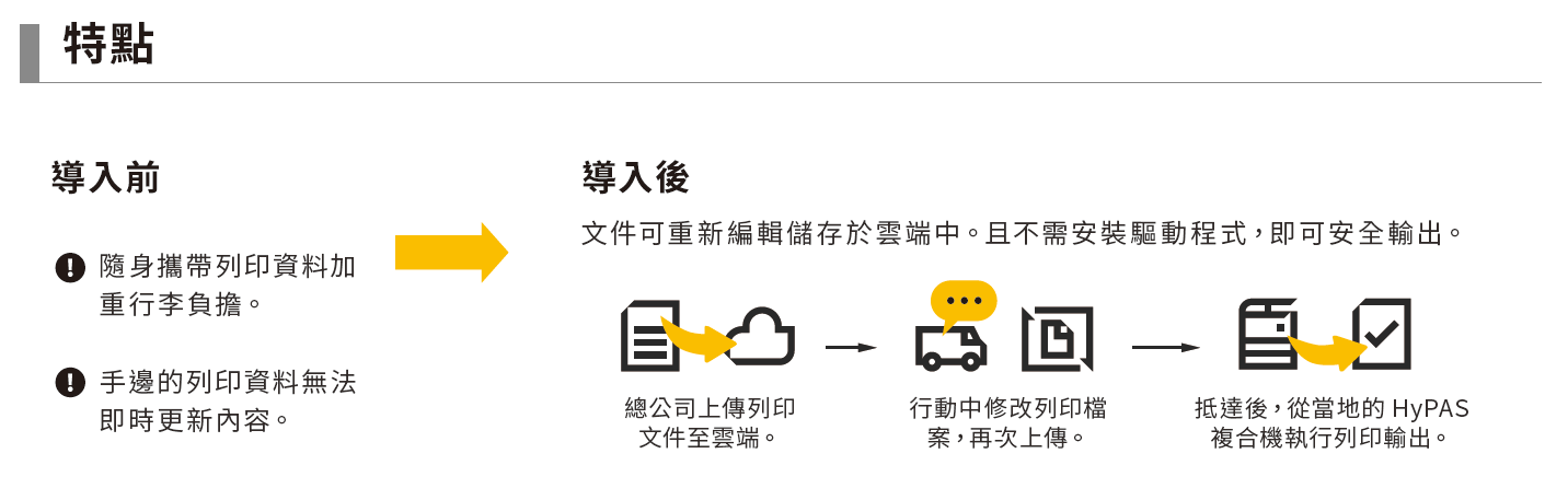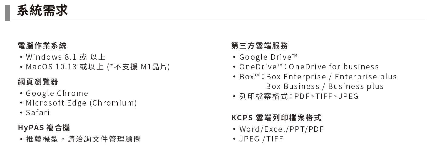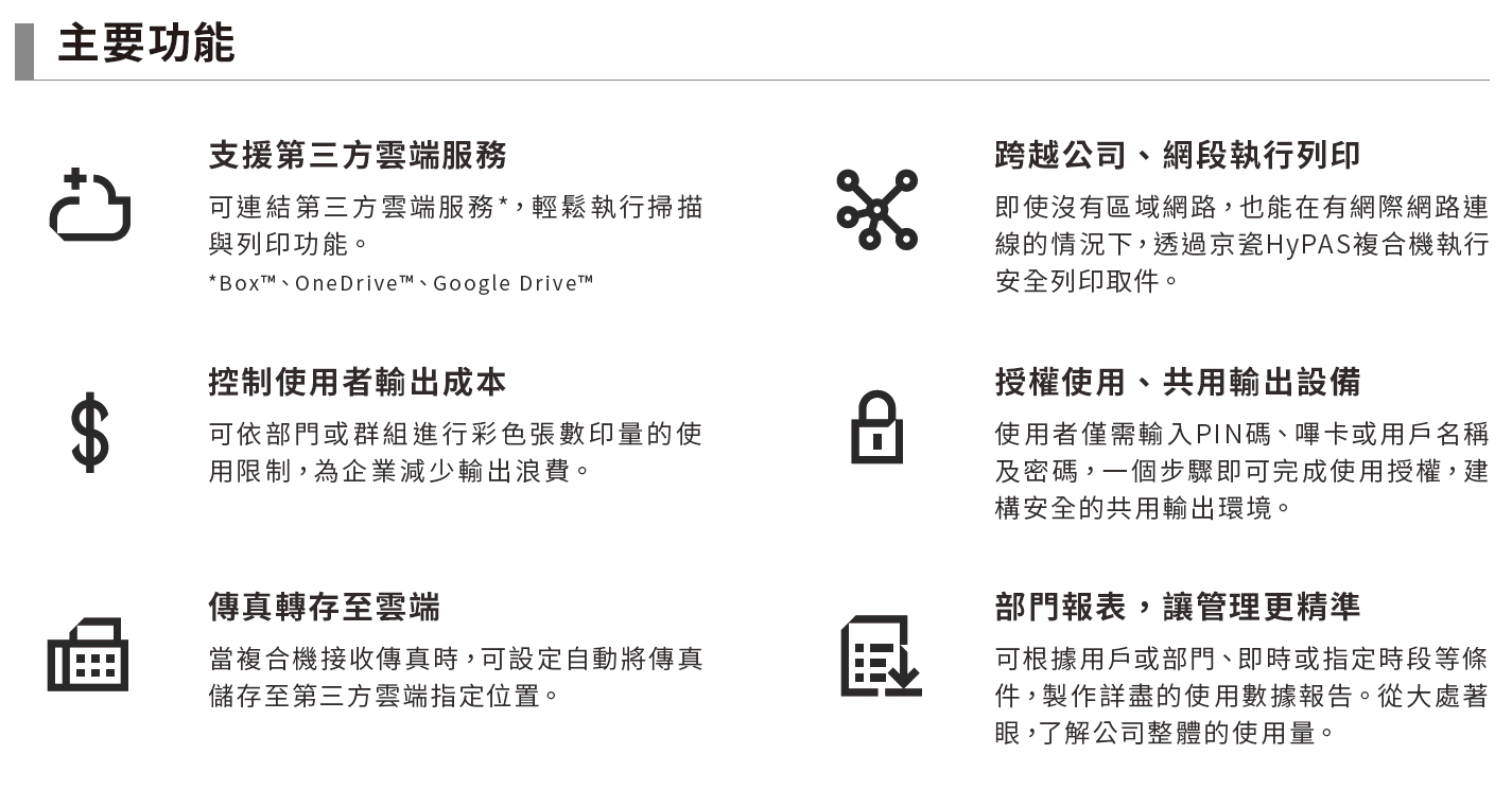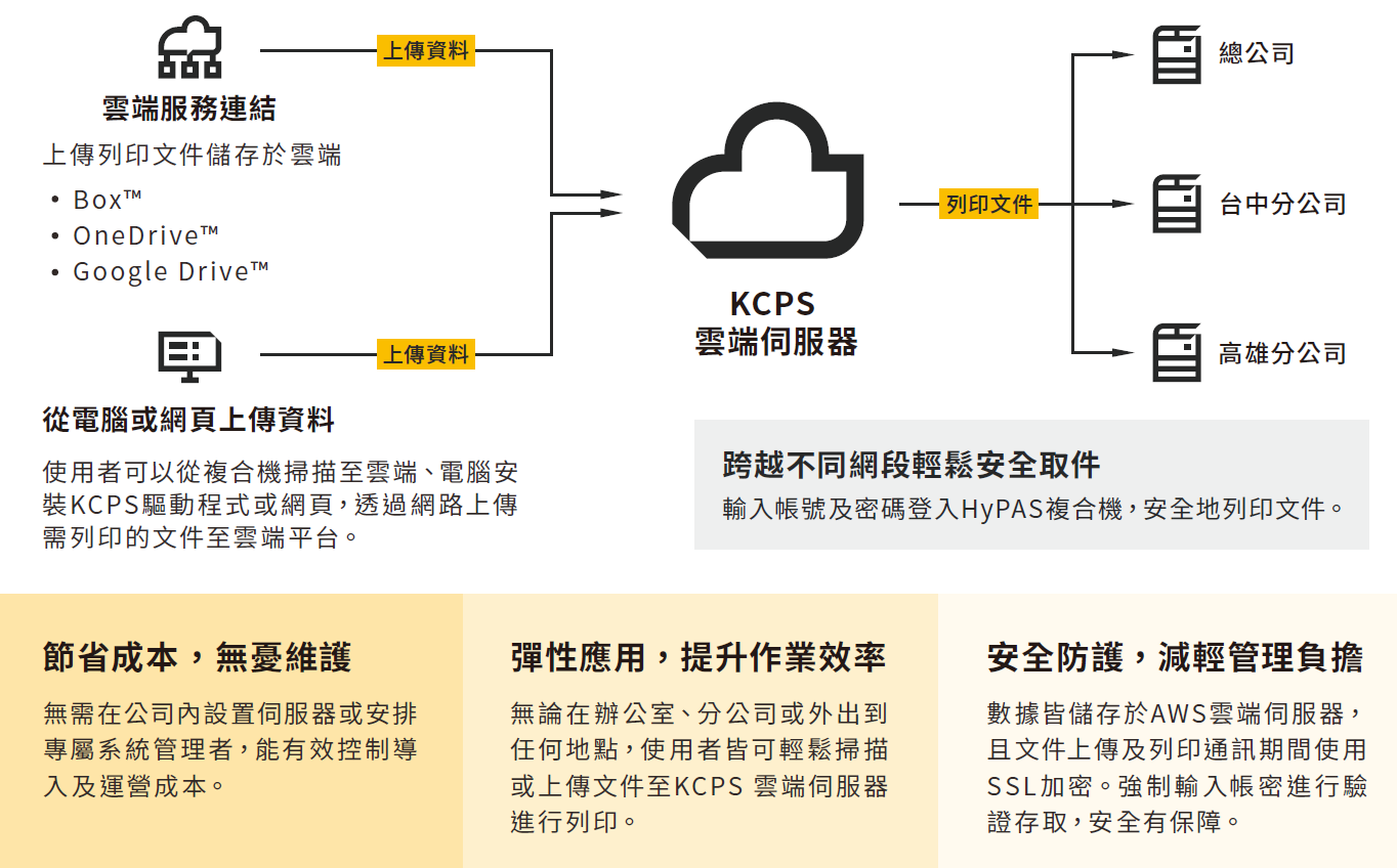 傳統辦公室的列印文件作業需安裝多個驅動程式,十分耗時費事。若使用USB隨身碟進行列印,則可能有資料外洩的風險。 KYOCERA Cloud Print and Scan (簡稱KCPS) 提供您最佳解決方案。您可以將列印文件從電腦上傳至雲端伺服器,在所在地點的任何一台複合機,輸入您的帳號及密碼後,執行安全列印,無需擔心資料遺失的風險、免去安裝印表機驅動程式的困擾。